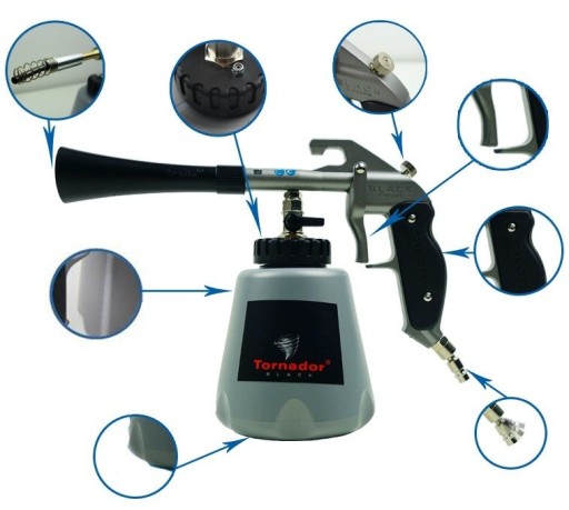 Pistolet Tornador Black czyści w krótkim czasie wszystkie trudno dostępne miejsca w twoim pojeździe oraz usunie błyskawicznie plamy z tapicerki i podsufitki beż konieczności czekania na wyschniecie.