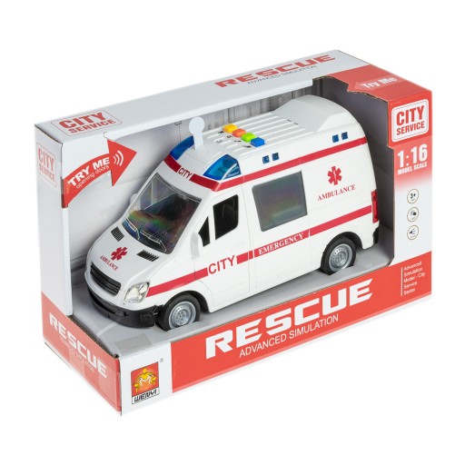 Otwarte kolorowe pudełko przekazuje wszystkie najważniejsze informacje dotyczące zabawki. Chłopcy uwielbiają bawić się samochodami. Najlepsze są takie, które odzwierciedlają w detalach prawdziwe pojazdy. Karetka to pojazd, który zainteresuje każde dziecko. Migające światła, odgłosy klaksonu, silnika pozwolą odtwarzać akcje ratunkowe i bawić się w bohaterów dnia - lekarzy.