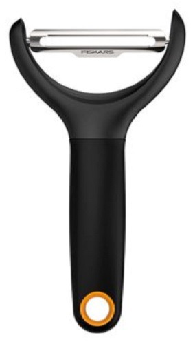 Praktyczny obierak z szerokim ostrzem, o długości 15 cm, marki FISKARS, doskonale dopasowuje się do krzywizny powierzchni.