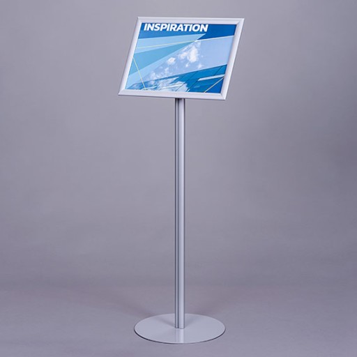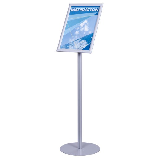 Stojak informacyjny TOP 1 wykonany jest z elementów z anodowanego aluminium i stabilnej okrągłej podstawy malowanej proszkowo. U szczytu znajduje się ruchoma głowica na której zamontowano ramkę OWZ z folią antyrefleksyjną zabezpieczającą plakat lub ulotkę.