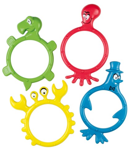 Kolorowe plastikowe kółka w kształcie zwierząt morskich do wyławiania z dna basenu.