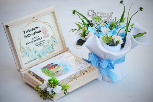 Wyjątkowy i piękny zestaw: ilustrowana biblia w drewnianej szkatułce z personalizacją oraz bukiet z ręczników - doskonały prezent na Chrzest Święty - praktyczny oraz orginalny.