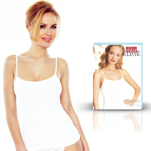 W koszulkach damskich marki Eldar dekolt i ramiączka, zależnie od zakupionego modelu, jest wykonany z ażurowej koronki o kwiatowym motywie lub w klasycznym, prostym stylu.
