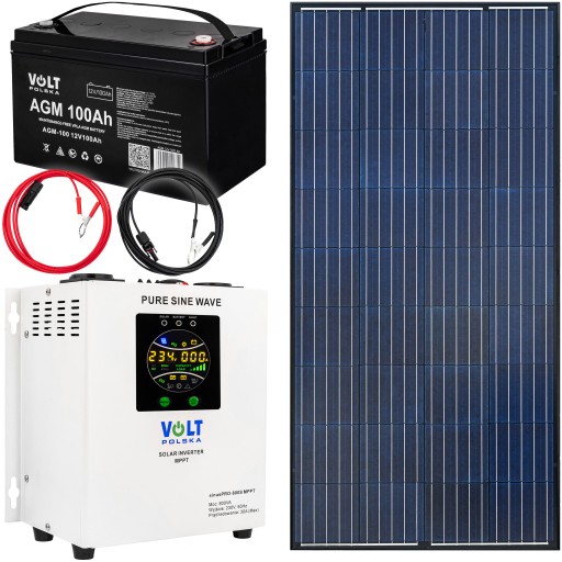 Gotowy zestaw fotowoltaiczny oparty na przetwornicy z wbudowanym regulatorem napięcia firmy Volt Polska wraz z panelem fotowoltaicznym o mocy 180W, akumulatorem 100Ah i przewodami, końcówkami do podłączenia.