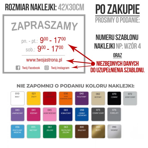 Po zakupie prosimy o podanie w wiadomości dla sprzedającego informacji o numerze szablonu który mamy przygotować oraz wszystkich niezbędnych informacji które na nim się znajdują np: