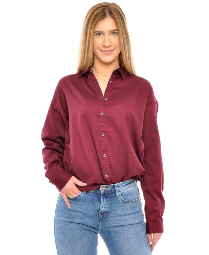 Damska koszula z długim rękawem zapinana na guziki. Luźny krój. Mankiety zapinane na guziki. Kolor bordowy.