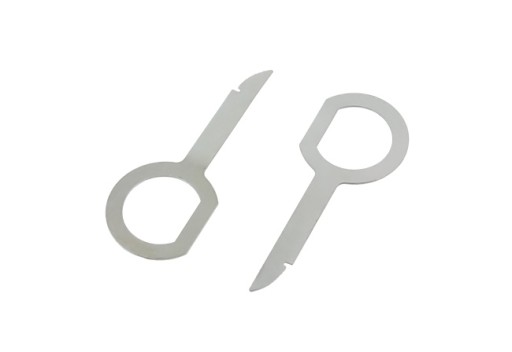Uniwersalny zestaw 2 sztuk kluczy (wyjmaków) do wyjmowania radia samochodowego.