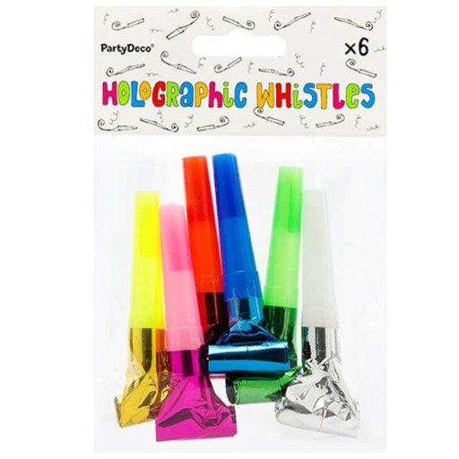 Komplet 6 gwizdków w róznych metaliczno holograficznych kolorach. Są idealne na imprezę urodzinową dla najmłodszych. Przydają się wszędzie tam gdzie potrzebne jest dużo hałasu i dużo zabawy :)
