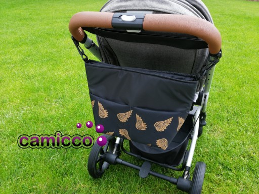 Wyposażona jest w regulowany pasek, który doskonale sprawdzi się za równo do zawieszenia na wózku jak i do noszenia na ramieniu, oraz w uchwyty do zamocowania na każdej rączce wózka