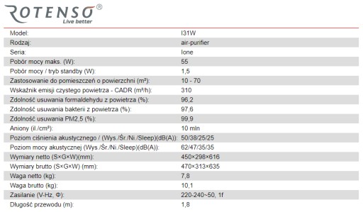 Oczyszczacz marki Rotenso to wysokiej klasy system zdrowego powietrza. Usuwa z domu różnego rodzaju zanieczyszczenia, bakterie, grzyby, pierwotniaki, roztocza, dym papierosowy oraz inne szkodliwe dla zdrowia substancje, takie jak benzen, formaldehyd, TVOC, ksylen czy pył zawieszony. Skuteczność oczyszczania w każdym przypadku sięga blisko 100%. Dzięki oczyszczaczowi powietrza Rotenso możesz również pozbyć się z mieszkania nieprzyjemnych zapachów, cząsteczek brudu czy włosów. Pobierz załączniki aby dowiedzieć się więcej o szczegółach urządzenia.