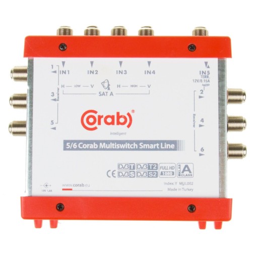 Multiswitch Corab 5/6 Smart Line z 4 wejściami satelitarnymi dla jednego konwertera Quattro i 1 wejściem z anteny telewizji naziemnej (dvb-t) umożliwia dystrybucję sygnału do 6 gniazd abonenckich TV SAT (gniazda są dostępne w naszej ofercie).