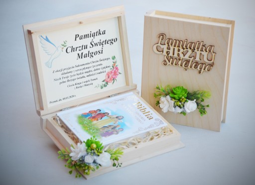 Wyjątkowy i piękny zestaw: ilustrowana biblia w drewnianej szkatułce z personalizacją - doskonały prezent na Chrzest Święty - praktyczny oraz oryginalny.