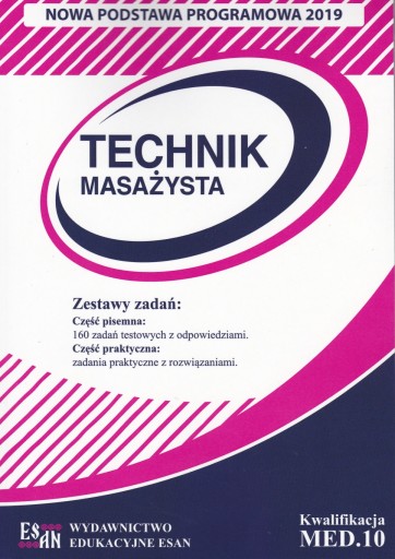 Publikacja stanowi materiał w zakresie przygotowania do egzaminu zawodowego w zawodzie - technik masażysta (kwalifikacja MED.10). Zadania obejmują tematykę i zagadnienia odzwierciedlajuące umiejętności ujęte w podstawie programowej kształcenia w zawodzie technik masażysta, w wyodrębnionej kwalifikacji MED.10Są to zestawy nowych testów i zadań praktycznych, opracowane zgodnie z nową podstawą programową kształcenia obowiązującego od roku szkolnego 2019.