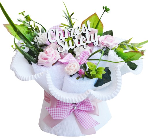 Kwiatowa dekoracja i zielone dodatki tworzą wyjątkowy bukiet wyglądający, jak żywy. Będzie cieszył oko dłużej niż cięte kwiaty. Całość wykonana jest bardzo starannie przez wykwalifikowane florystki. Do każdego bukietu dokładany jest drewniany napis "Chrzest Święty".