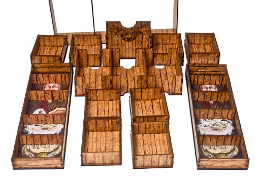 Zdjęcia poniżej przedstawiają przykładowe możliwości ułożenia elementów w insercie. Poniższy insert jest wcześniejszą wersją, która aktualnie została udoskonalona poprzez dodanie ekspozytora ułatwiającego rozgrywkę w miejsce części dużego pojemnika na karty.