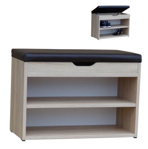 Praktyczna szafka na buty z grubym siedziskiem o szerokości 70cm pod którym znajduje się funkcjonalny schowek otwierany na metalowych zawiasach. Miękkie siedzisko pozwala w przyjemny sposób usiąść przy zakładaniu butów. Mebel przeznaczony dla osób, które cenią sobie nowoczesny styl i elegancję.