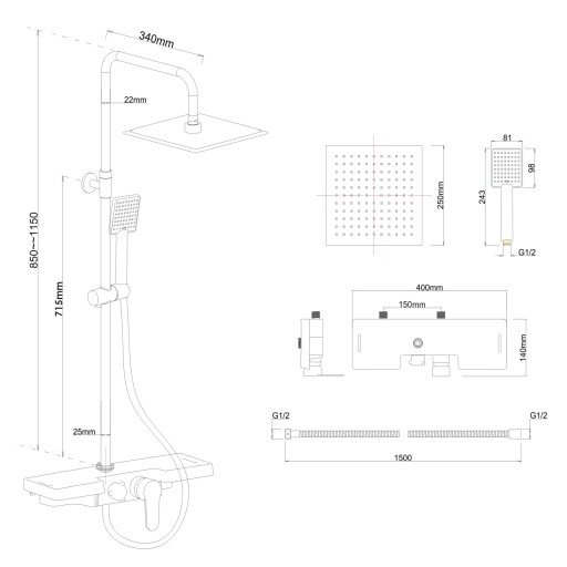 Zestaw natryskowy z półką i deszczownicą 25 cm - czarny