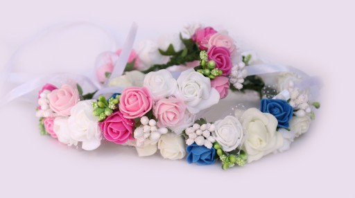 Wianek na koczka. Wykonany ręcznie, z piankowych kwiatów doskonale imitujących kwiaty żywe. Regulowany satynowymi wstążeczkami, obwód 35cm, grubość 3,5cm. W delikatnych kolorach bieli oraz trzech odcieniach różu (jasny róż, cukierkowy róż oraz fuksja).