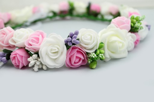 Wianek komunijny, wykonany ręcznie, w pastelowych odcieniach. Wykonany z piankowych róż doskonale imitujących kwiaty żywe, z dodatkiem perełek.