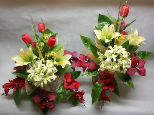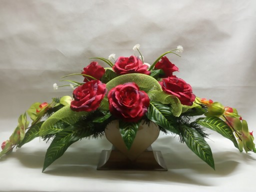 Kompozycja sztuczna (tzw. stroik, ikebana) jest wykonana z sztucznej choiny w doniczce plastikowej podłużnej tzw. SERCU co daje jej stabilność.