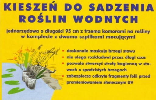 Kieszenie do sadzenia roślin wodnych umożliwiają obsadzanie stromych brzegów stawu. Zabezpieczają przy okazji folię przed mechanicznymi uszkodzeniami oraz promieniowaniem UV. Kieszenie wykonane są z włókniny polipropylenowej co daje im dużą wytrzymałość i trwałość.