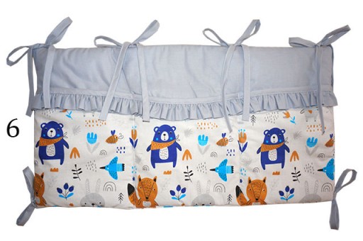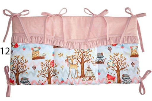 Mocowany jest przy pomocy górnych i bocznych troczków. Można go zamontować w dowolnym miejscu łóżeczka.