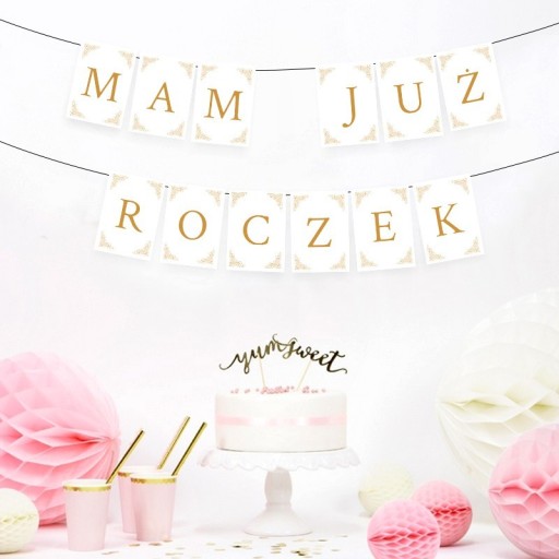 Biało-złoty baner przygotowany na Roczek to uniwersalna dekoracja pomieszczenia zarówno na Roczek chłopca, jak i dziewczynki. Duży format sprawia, że to okazała ozdoba, która zachwyci każdego. Pięknie prezentuje się nad urodzinowym stołem!