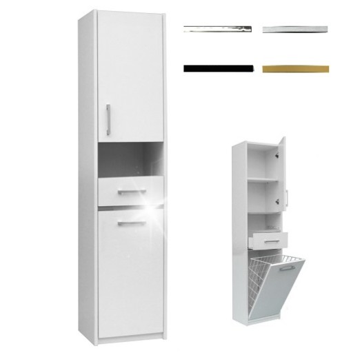 Pojemna szafka z koszem na bieliznę o szerokości 40cm. Posiada dwoje drzwiczek. Za górnymi kryją się dwie pojemne półki. Pomiędzy drzwiczkami umieszczona jest wysuwana szuflada oraz zewnętrzna półka. Dolne, uchylne drzwiczki posiadają zamontowany pojemny kosz na bieliznę. Szafka oklejona obrzeżem PCV podwyższającą odporność na wilgoć. Szafka posiada do wyboru cztery kolory uchwytów: aluminium, chrom, czarny lub złoty. Mebel przeznaczony dla osób, które cenią sobie nowoczesny styl i elegancję.