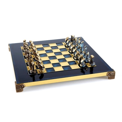 Szachy i szachownica wykonane zostały z troską o zachowanie najwyższej jakości. Waga kompletu:3,2kg; Wysokość króla 5,4 cm. Figury wykonane ze stopu cynku. Kolory: brązowe / błękitne Szachownica 28x28 cm, mosiądz. Kolory: błękitno - żółte; ręcznie malowane Wykończenie ręczne najwyższej klasy. Szachy zapakowane są w piękne, luksusowe, drewniane pudło. W środku starannie wykonana wypraska do układania i bezpiecznego przechowywania figur. Produkt w najwyższym stopniu ekskluzywny, przepiękny prezent. Prezent dla szachisty, piękny element dekoracyjny. Wyprodukowane w Grecji przez renomowaną firmę Manopoulos z kilkudziesięcioletnią tradycją produkcji. Szachy Manopoulos rozpoznawane są na całym świecie jako małe dzieła sztuki. Polecamy!