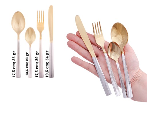 W tej ofercie kupujesz sztućce w kolorze złoto-srebrnym, jak na zdjęciu głównym. Zdjęcia są poglądowe.