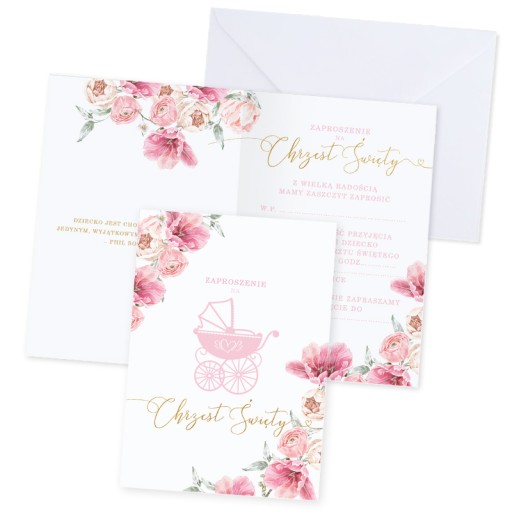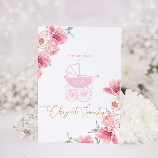 - Różowo-białe zaproszenia uniwersalne na uroczystość Chrztu Świętego. Zaproszenia wykonane z wysokiej jakości błyszczącego papieru. Okładkę zdobi motyw różowego wózka i kwiatów.