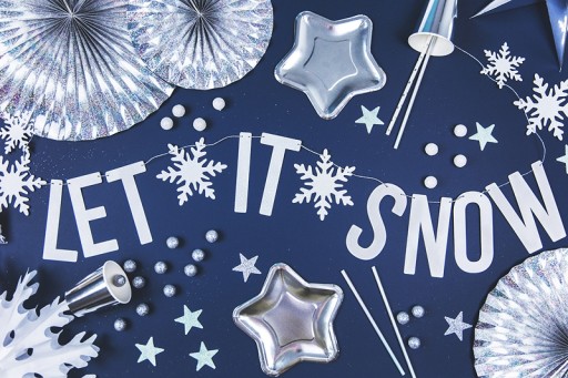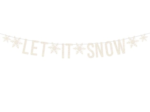 1. Baner Let it snow w kolorze białym holograficznym, zestaw zawiera literki oraz ok. 2 m srebrnego sznurka,