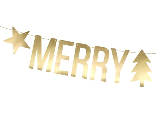 4. Baner Merry Christmas, wykonany z papieru w kolorze złotym lustrzanym, zestaw zawiera napisy oraz ok 1,5 m złotego sznurka,