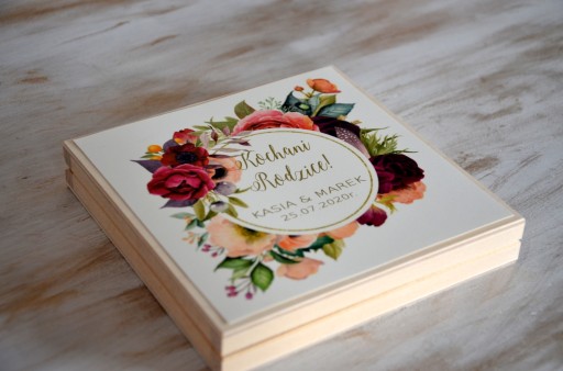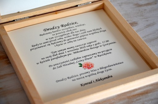 - Nadruk na górze pudełka (Kochanym Rodzicom, Kochanym Dziadkom, Drogiemu Świadkowi, Drogiej Świadkowej)