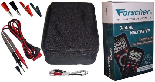 w zestawie : miernik uniwersalny Forscher FS8216 , etui , silikonowe przewody pomiarowe (komplet) , krokodylki (komplet) , adaptory banan 4mm (komplet), sonda temperatury