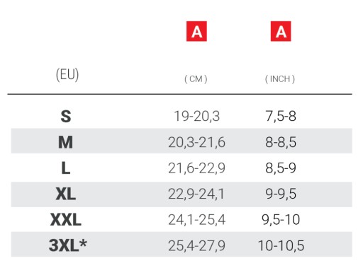 A: OBWÓD DŁONI - Zmierz obwód dłoni tak, aby lekko napięta taśma przechodziła przez kostki w ich najszerszym punkcie pomijając kciuk