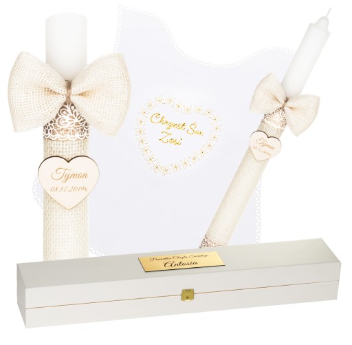 - rękodzieło - świeca jest owinięta materiałem jutowym, zdobiona dodatkowo w dwóch miejscach jutową wstęgą z białą koronką. Kokarda jutowa ze sztywnego materiału jest przytwierdzona na trwałe do świecy, sklejona i przywiązana sznurkiem.