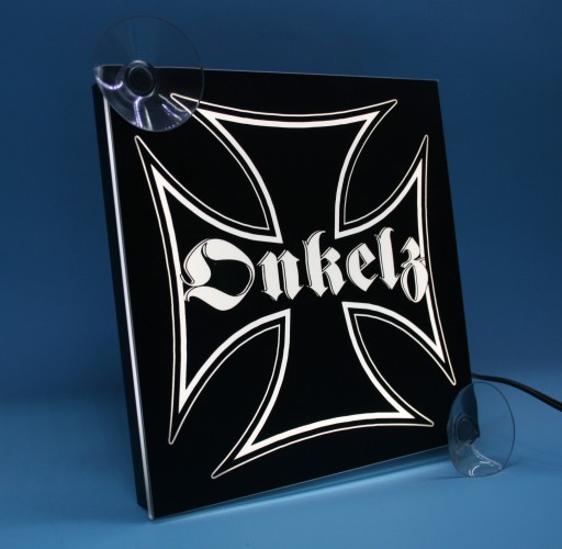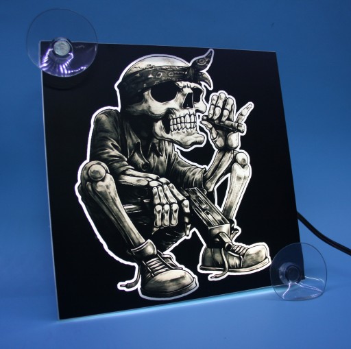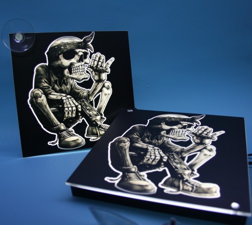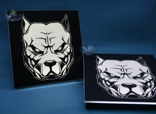 Tabliczka wykonana z płyty Plexiglass Evonic umieszczonej w czarnej kasecie z dibondu - płyta ze spienionego PCV pokryta z dwóch stron warstwą aluminium o grubości 0.3mm - odporna na zarysowania i wysoką temperaturę jaka ma miejsce za szybą auta w słoneczne dni. Boki tabliczki delikatnie wystają poza obrys kasety tworząc białą świecącą obramówkę.