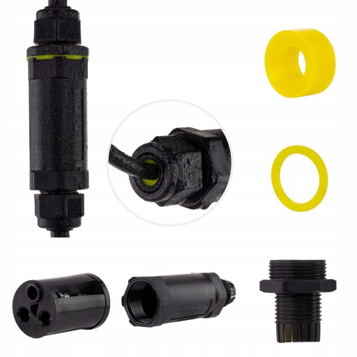 Solidne, skręcane złącze kablowe gwarantujące trwałe i szczelne połączenie. Idealne rozwiązanie, aby szybko połączyć i schować przewody, znakomicie sprawdza się jako element do przedłużenia przewodu lub zestaw naprawczy.