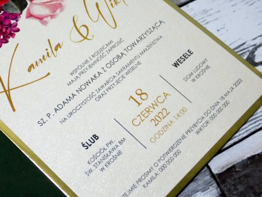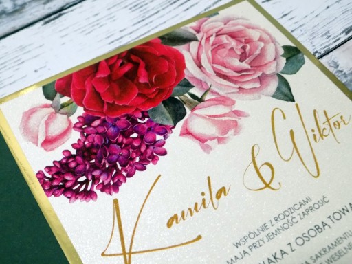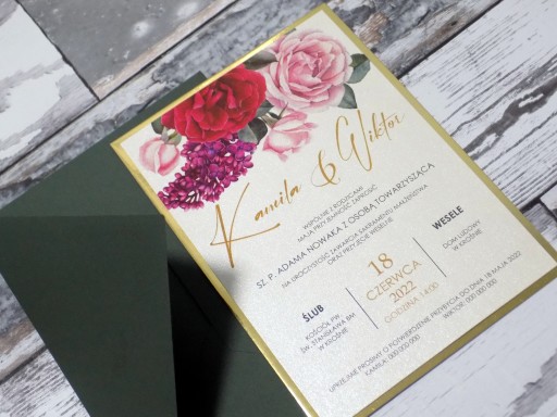 Oferuję Państwu eleganckie jednokartkowe zaproszenie/zawiadomienia ślubne w z pięknymi kolorowymi kwiatowymi grafikami. Druk kolorowy, piękne żywe kolory. Zaproszenia wykonane w formacie B6, z elegancką kopertą w zestawie. Wydruk na papierze perłowym, z delikatnymi połyskującymi drobinkami, podkładka lustrzana złota.