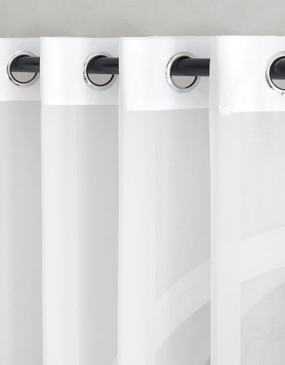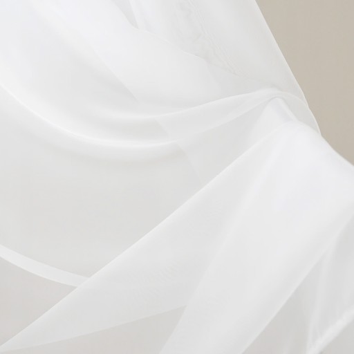 Materiał z białego woalu, użyty do stworzenia firany, nadaje jej delikatności i jedwabistej struktury. Transparentność woalu pozwala na delikatne przenikanie światła, co tworzy w pomieszczeniu miłą, naturalną iluminację.