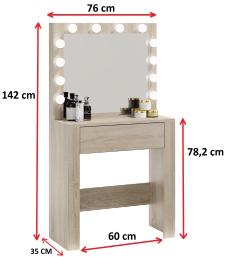 Włącznik światła znajduje się z boku lustra - jest intuicyjny w obsłudze, dyskretnie schowany.Toaletka posiada wygodna w otwieraniu szufladę z przegródkami .