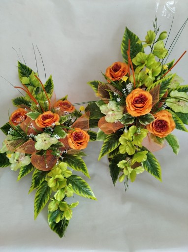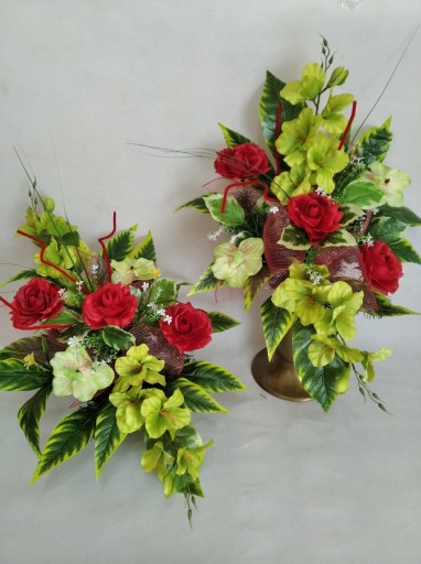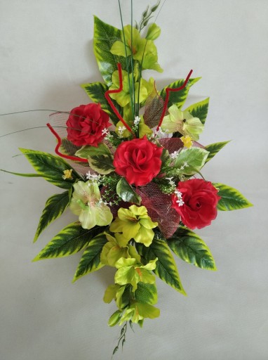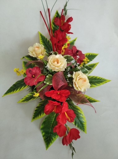 Wykonany na uniwersalnym flakonie plastikowym zabetonowanym z choiną sztuczną, gotowy tylko do włożenie do wazonu! Flakon ma średnice 12 cm od góry i 7 cm od dołu, ma 10 cm wysokości. Kompozycja do wazonu ma ok. 60 cm wysokości i 40 cm szerokości.