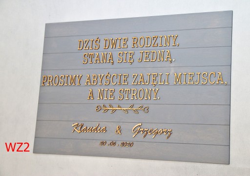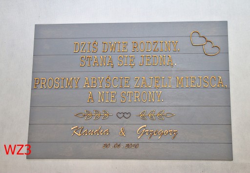 Elegancka całkowicie drewniana tablica powitalna - "Dziś dwie rodziny staną się jedną.."