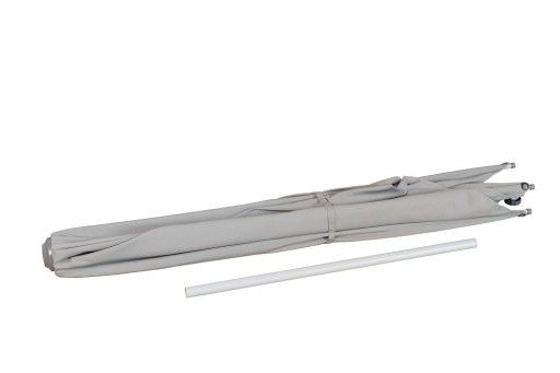 Stelaż parasola składa się z aluminiowego masztu o średnicy 38/35mm składanego z dwóch części i z ożebrowania stalowymi rurkami o średnicy 19mm. Regulacja wysokości parasola w granicach 90 cm.
