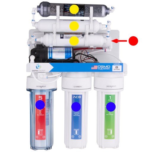 Woda przepływająca przez system poddana jest 8 stopniowej filtracji na którą składają się: