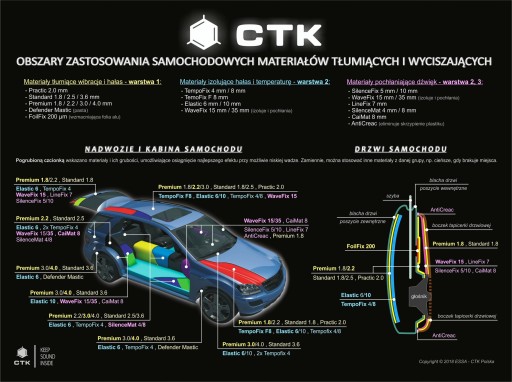 - wysoko efektywne materiały antywibracyjne tłumiące drgania i rezonanse elementów nadwozia oraz dodatkowo izolujące wnętrze od zewnętrznego hałasu - wysokiej jakości maty na bazie butylu, aluminium i polimerów o możliwie najwyższej wartości współczynnika MLF (np. maty tłumiące CTK Premium, CTK Standard),