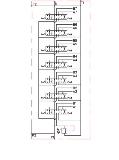 Zalecany przepływ oleju układzie: 0 - 40 l/min. Przykładowe sterowanie: siedem siłowników 2-stronnego działania.
