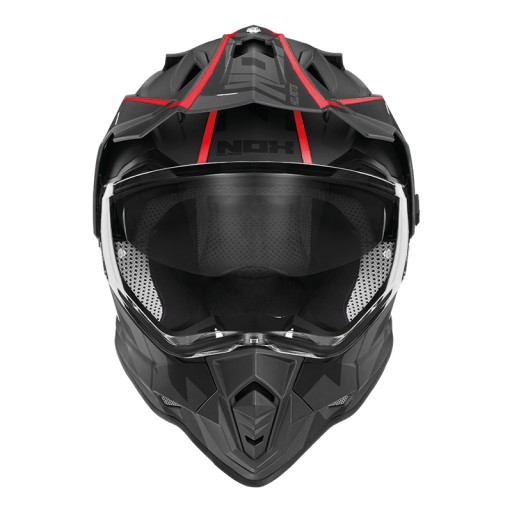 - Enduro Cross NOX N312 to kask podróżny z przyłbicą i daszkiem, wykonany z poliwęglanowej skorupy przy użyciu bardzo wytrzymałych materiałów.