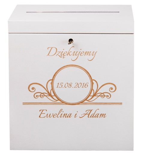 Na tej aukcji prezentujemy pudełko na koperty i życzenia weselne, które cieszy się coraz większym zainteresowaniem wśród Młodych Par. Dzięki zastosowaniu zamka z ozdobnym kluczykiem mają Państwo pewność że skrzynka jest dobrze zabezpieczona przed otwarciem, a przy okazji nabiera niepowtarzalnego wyglądu. Po ślubie może służyć także w inny sposób ponieważ konstrukcja ta jest bardzo trwała, a wieczko otwierane na zawiasach. Skrzynkę można dowolnie spersonalizować grawerując na niej imiona i datę uroczystości. Dla ułatwienia mogą Państwo wybrać jeden z poniższych wzorów lub przesłać swój pomysł.